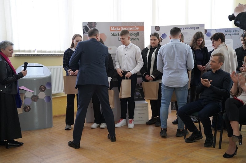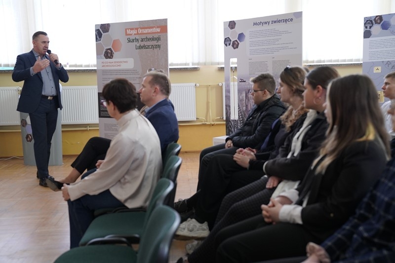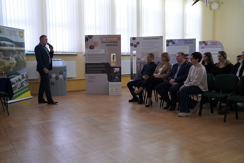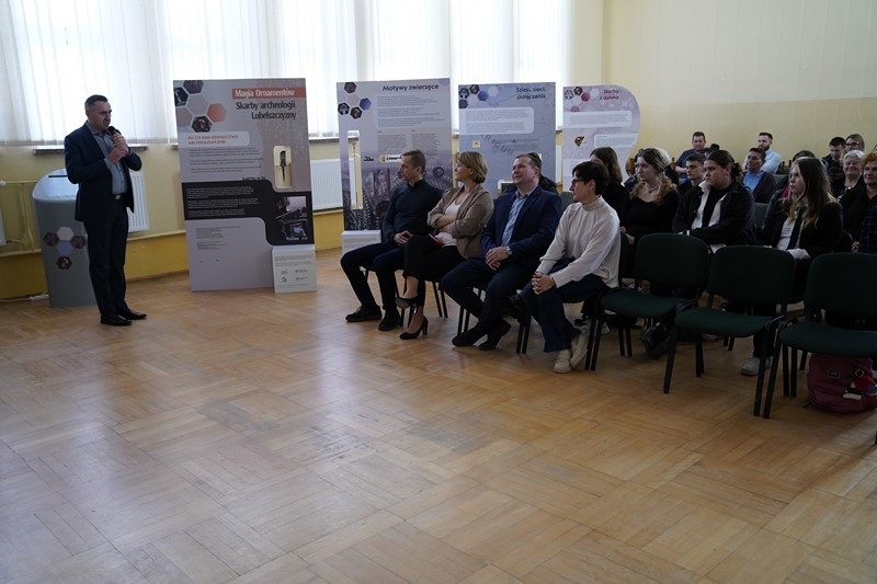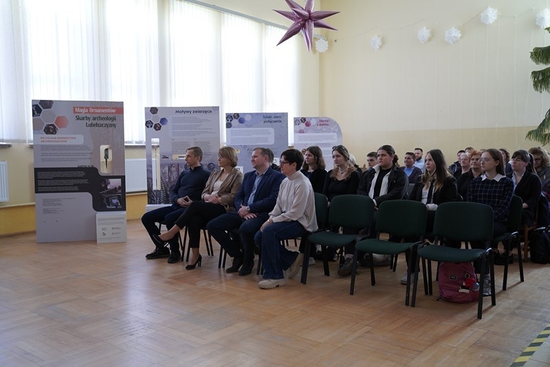 Szkolna grupa fascynatów archeologią Ziemi Hrubieszowskiej miała możliwość uczestniczenia w kolejnym przedsięwzięciu archeologicznym. Dzięki uprzejmości pana Tomasza Zająca, wójta Gminy Hrubieszów i pana Dyrektora Muzeum im. ks. Stanisława Staszica Bartłomieja Barteckiego, młodzież I LO im. ks. S. Staszica, biorąca, jesienią bieżącego szkolnego, udział w projekcie polsko – norweskim została zaproszona do Gminnego Ośrodka Kultury w Wołajowicach w dniu 4 kwietnia br. na otwarcie mobilnej wystawy archeologicznej pt. „Magia ornamentów. Skarby archeologii Lubelszczyzny” przygotowanej przez Martę Cyran, Macieja Drewniaka i Aleksandrę Sztal z Muzeum Narodowego w Lublinie.