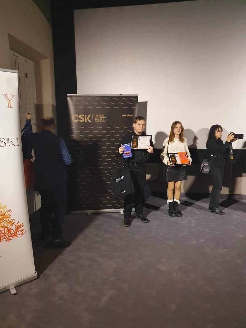 Wśród nich znaleźli się nasi młodzi miłośnicy poezji - uczniowie I Liceum Ogólnokształcącego im. ks. Stanisława Staszica. Kornelia Kruk z klasy IIID oraz Kacper Kalemba z klasy IB, w dniu 29 listopada 2023r. reprezentowali powiat hrubieszowski. Wymagające jury Konkursu dostrzegło wyjątkowy talent recytatorski Kacpra i przyznało mu wyróżnienie w kategorii szkoła ponadpodstawowa. Instruktorem naszego laureata jest Pani Alicja Borkowska. W sposób niezwykle wrażliwy zaprezentowała się jego koleżanka Kornelia, którą do występu przygotowywała Pani Katarzyna Krotkiewicz. Uroczyste wręczenie Kacprowi wyróżnienia i jego występ w Koncercie Laureatów odbył się 6 grudnia b.r. w Sali Kinowej w Centrum Kultury w Lublinie.