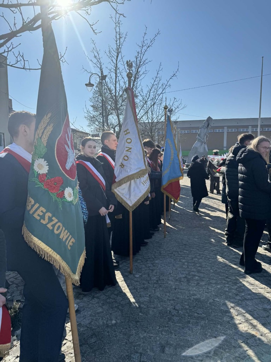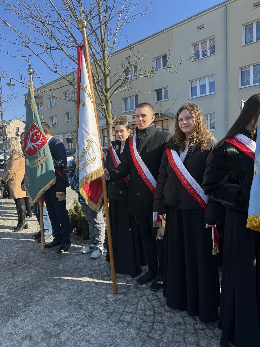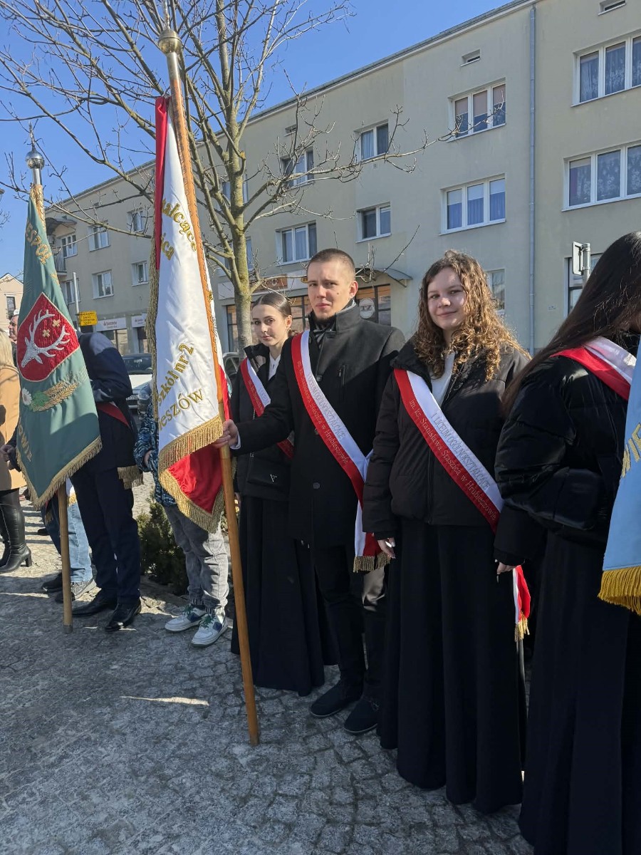 W hrubieszowskich obchodach I LO im. ks. Stanisława Staszica reprezentował poczet sztandarowy w składzie: Karolina Jasińska (III B), Oliwia Mączka (III A), Piotr Koroński (III A), pod opieką p. Joanny Pudłowskiej. Szkoła o ponad 100-letniej historii dba o przekazywanie uczniom wartości patriotycznych nie tylko w kontekście ogólnonarodowym, ale także tym lokalnym, dotyczącym miejsc, w których młodzież wzrasta i dojrzewa na co dzień. Członkini pocztu, Karolina Jasińska jest prawnuczką jednej z ofiar totalitaryzmu, Józefa Jasińskiego. 26 lutego 2026 r. wraz z rodziną wzięła udział w uroczystości w Pałacu Prezydenckim, w czasie której członkowie rodzin ofiar totalitaryzmów odebrali z rąk Prezydenta RP Karola Nawrockiego dokumenty potwierdzające tożsamość ich bliskich. Zapewne w wielu rodzinach naszych uczniów kultywuje się pamięć o cichych bohaterach trudnej polskiej historii. Nasze babcie, prababcie, dziadkowie i pradziadkowie to niejednokrotnie ludzie ogromnej odwagi, o czym musimy stale pamiętać, również dzięki takim świętom jak dzisiejsze.