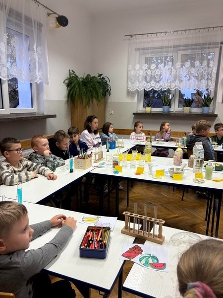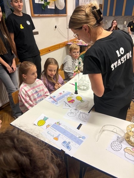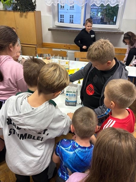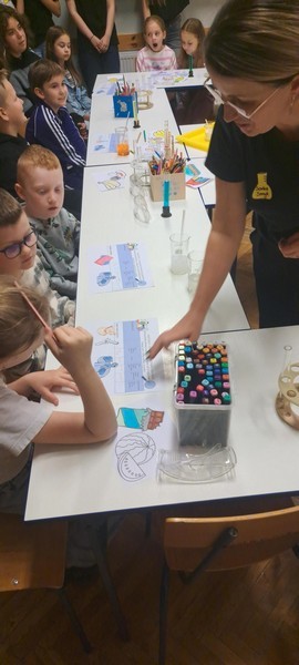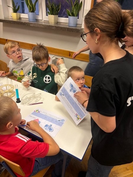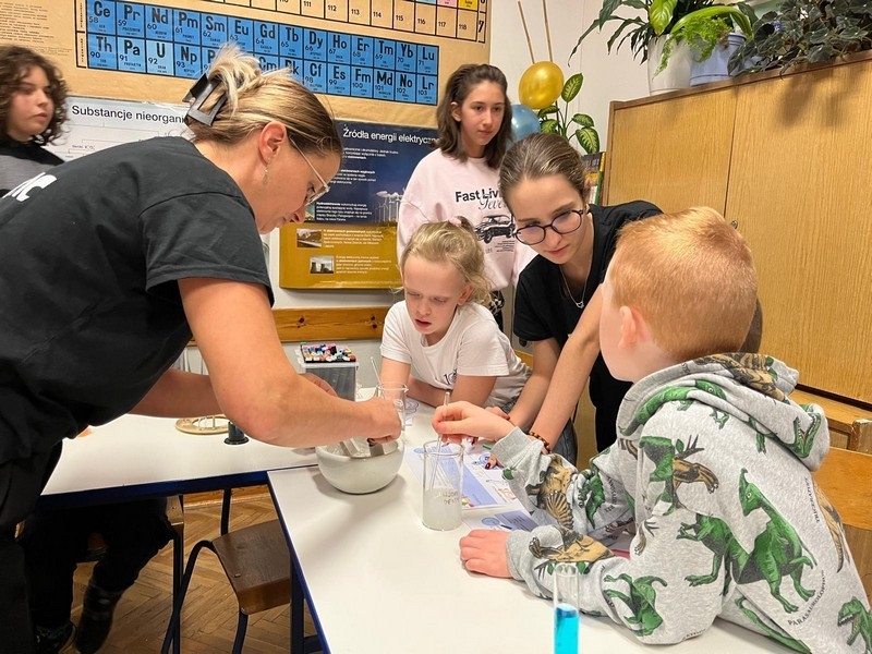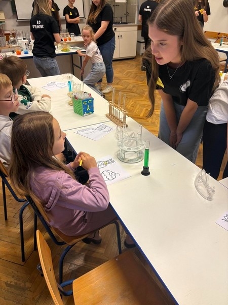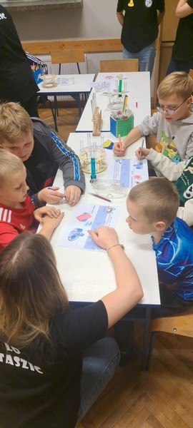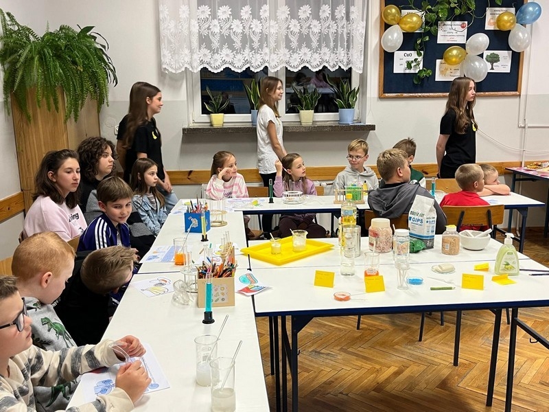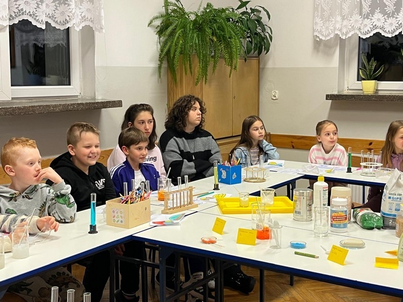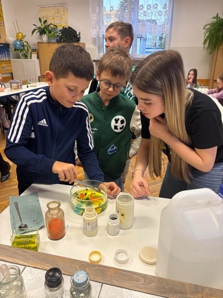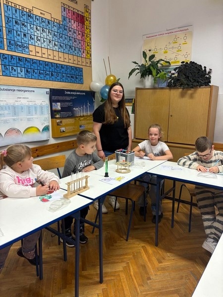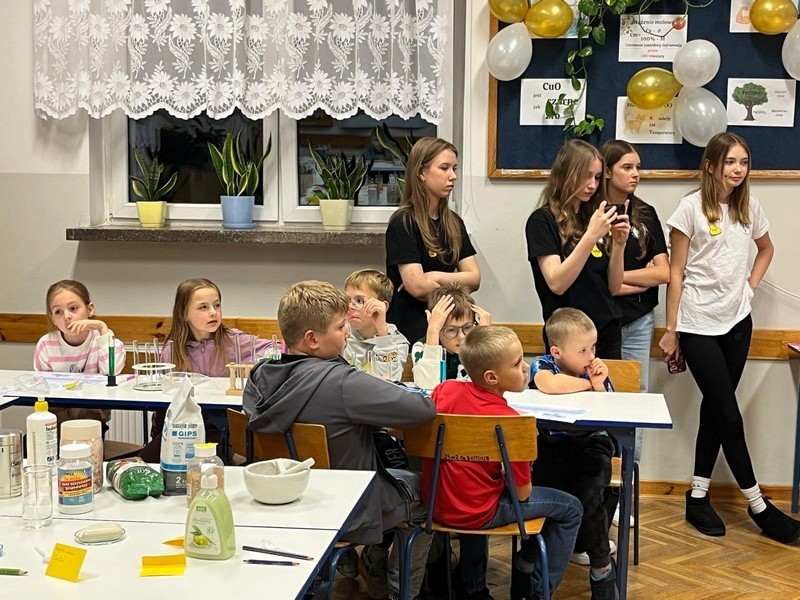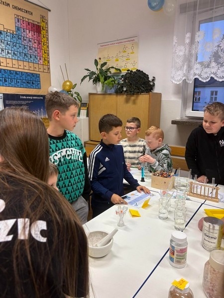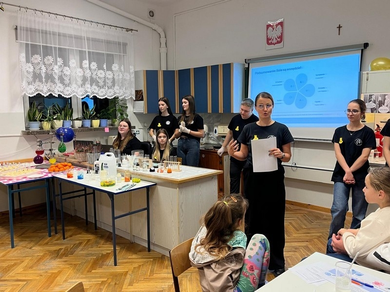 Dzieci miały okazję uczestniczyć w zajęciach chemicznych, na których przez zabawę i doświadczenia poznały właściwości i zastosowanie wybranych soli. Warsztaty przygotowali uczniowie z klasy 2B i 3B. Zajęciom towarzyszyła dobra atmosfera, a na koniec na uczestników czekał słodki poczęstunek.