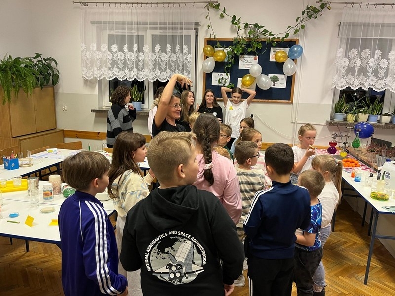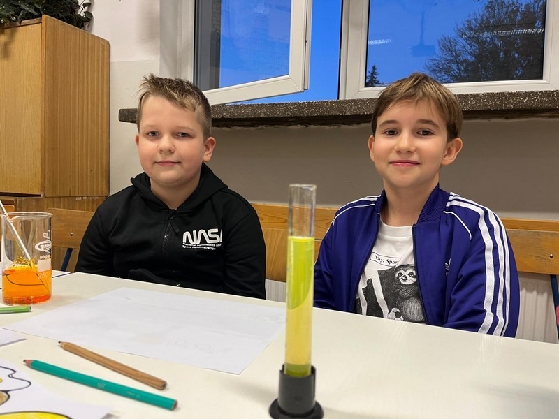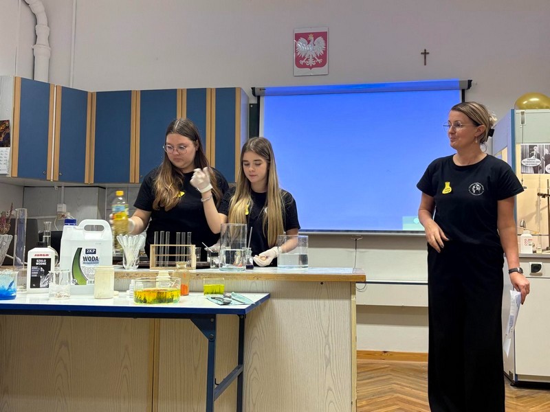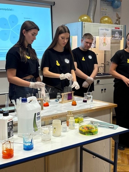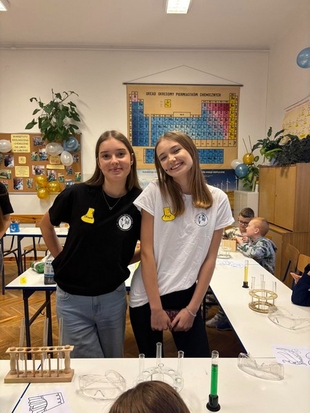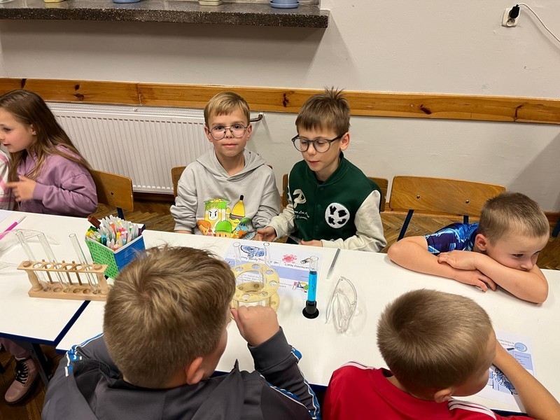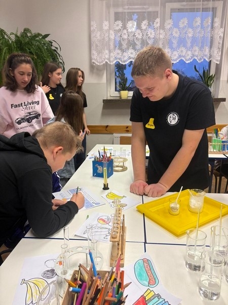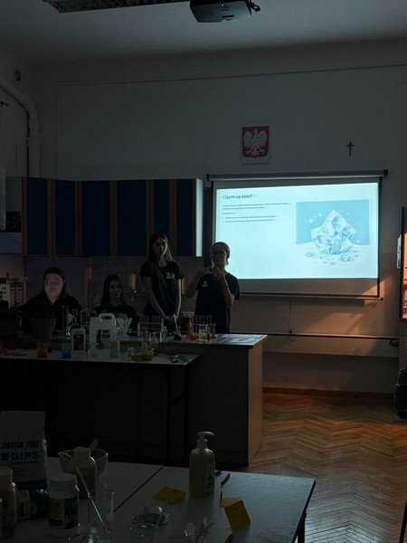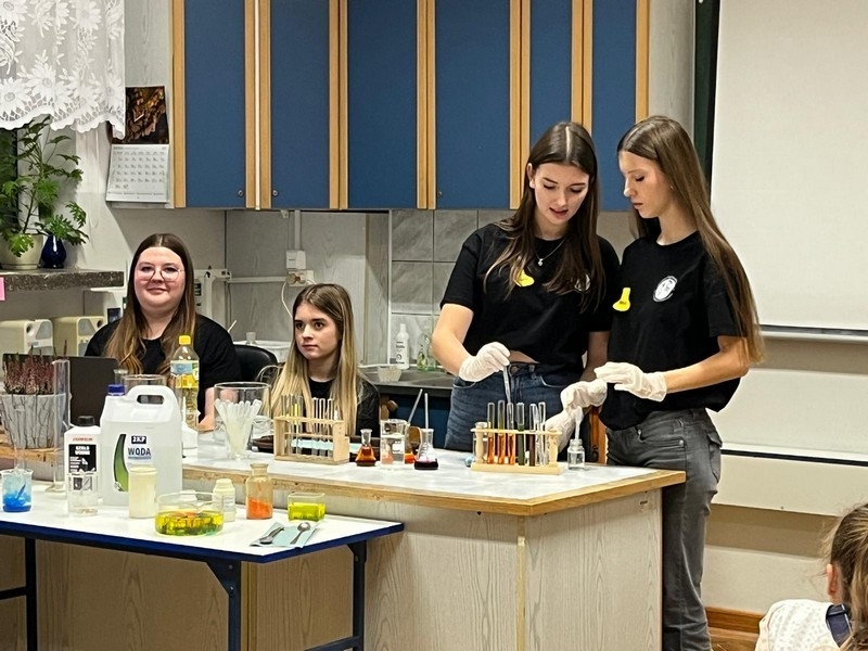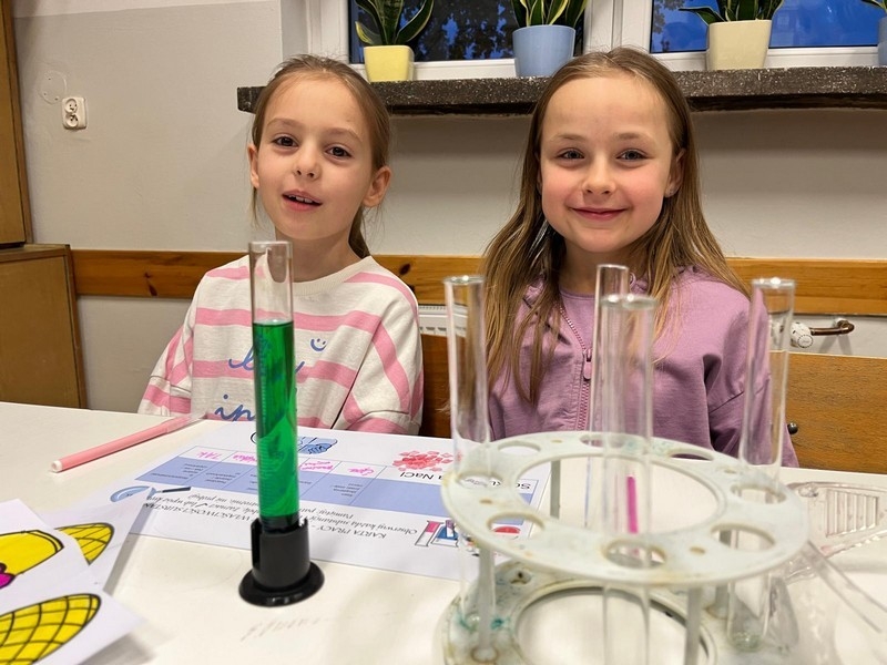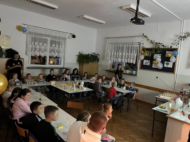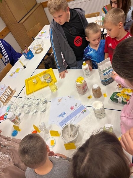 Dzieci miały okazję uczestniczyć w zajęciach chemicznych, na których przez zabawę i doświadczenia poznały właściwości i zastosowanie wybranych soli. Warsztaty przygotowali uczniowie z klasy 2B i 3B. Zajęciom towarzyszyła dobra atmosfera, a na koniec na uczestników czekał słodki poczęstunek.