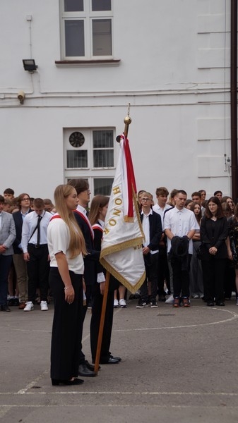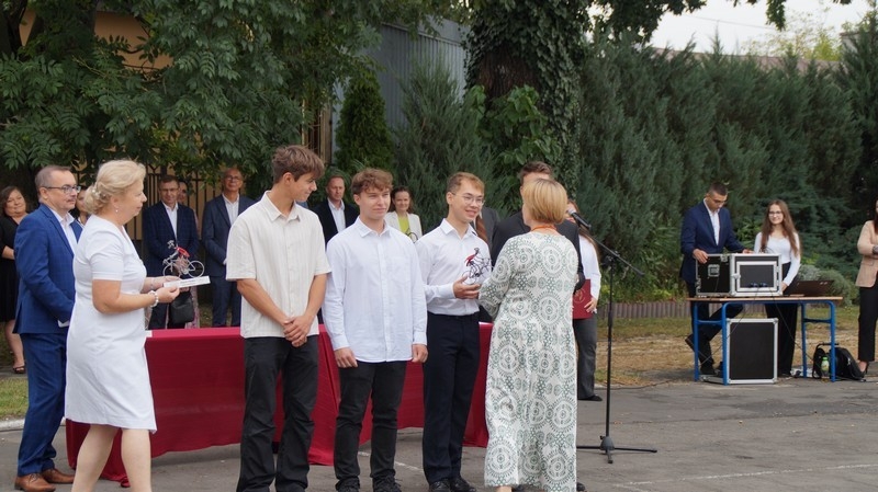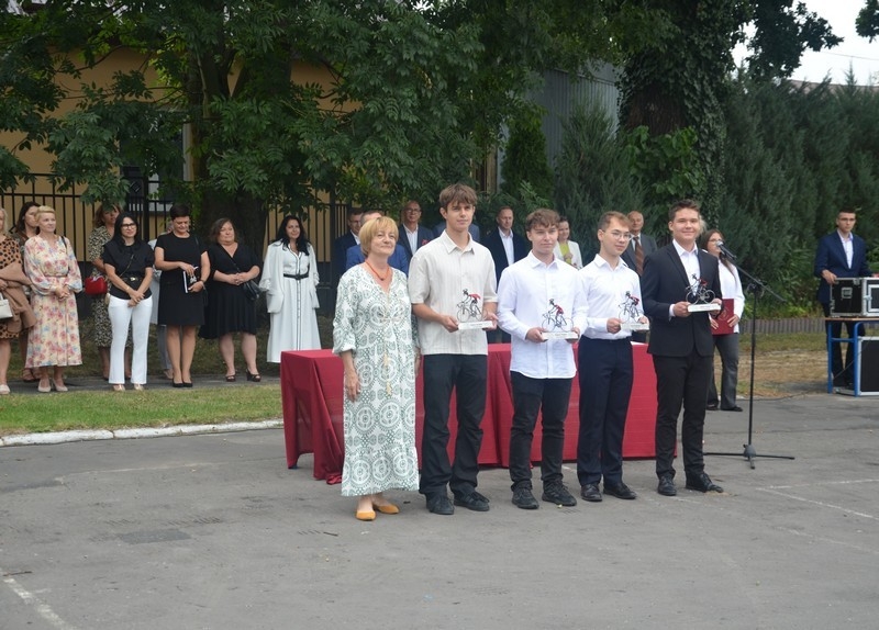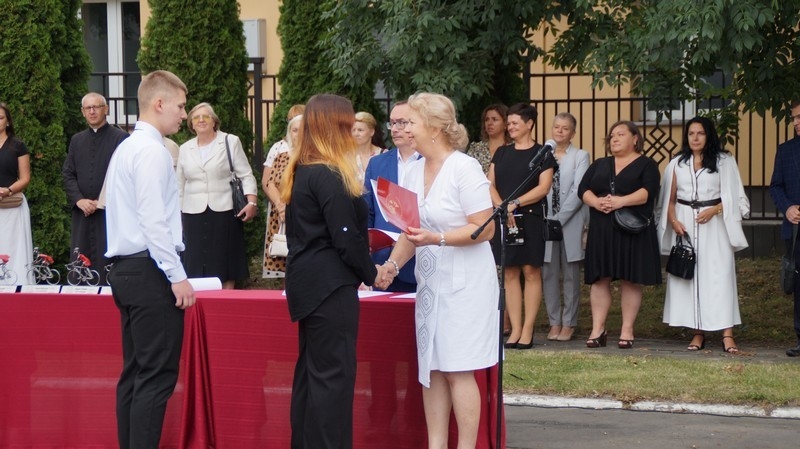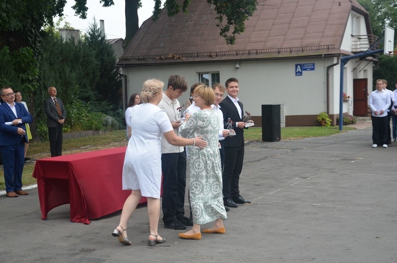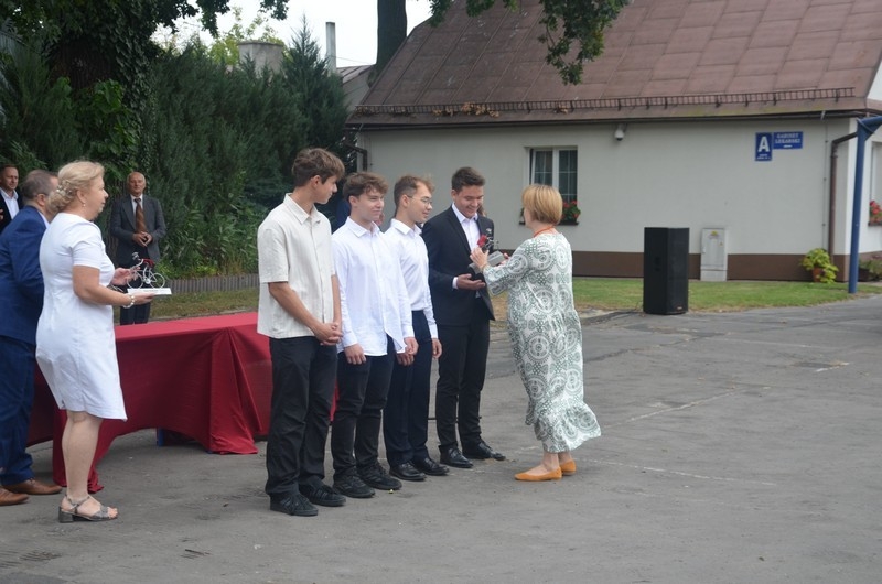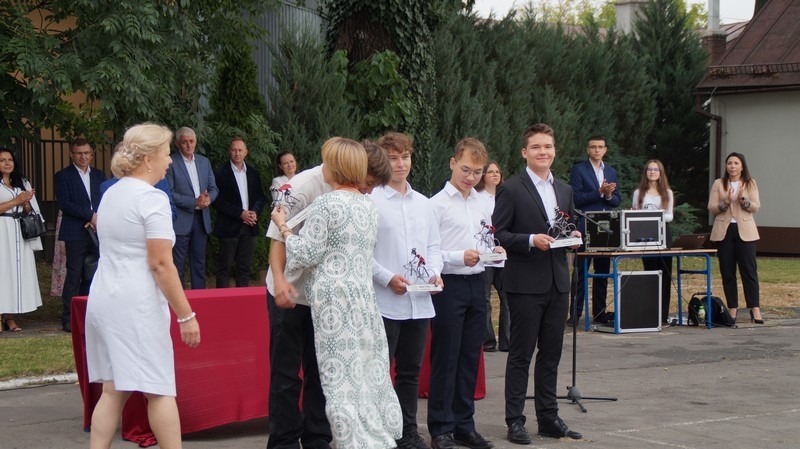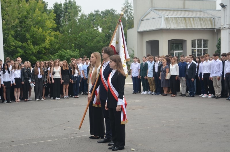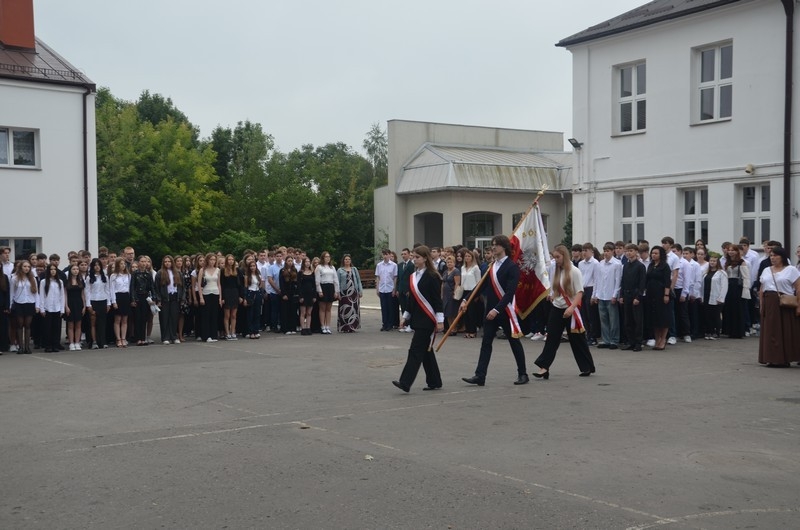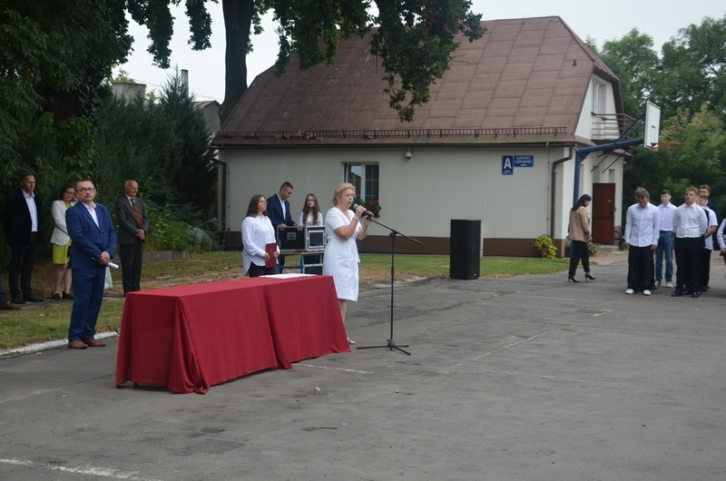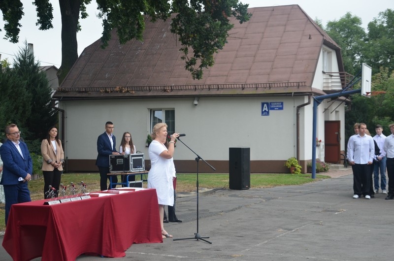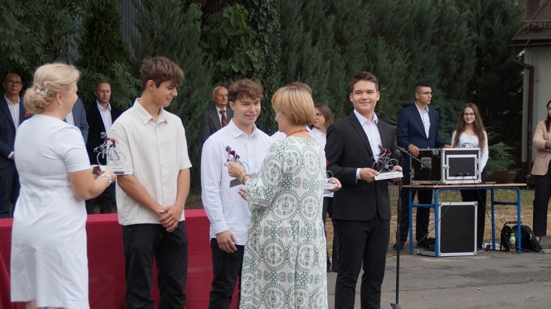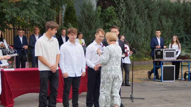 Pani dyrektor Alicja Borkowska w krótkim wystąpieniu powitała wszystkie roczniki uczniów, przypomniała o kolejnej rocznicy wybuchu II wojny światowej - pamięć poległych została uczczona minutą ciszy. Głos zabrała również przewodnicząca szkoły - Dominika Zezula. Następnie przedstawiciele klas pierwszych wzięli udział w ślubowaniu na sztandar szkoły. Rozpoczęcie roku szkolnego było również doskonałą okazją, aby przedstawić uczniów, którzy wyróżnili się szczególnymi osiągnięciami. Pani dyrektor Alicja Borkowska wręczyła stypendia im. płk Franciszka Kornickiego absolwentom szkoły: Wiktorii Bonieckiej, Filipowi Kowalewskiemu (stypendium odebrała mama Filipa) oraz uczniowi klasy IV d: Filipowi Szymańskiemu. Prawdziwą niespodzianką było przekazanie pamiątkowych statuetek uczestnikom wakacyjnej rowerowej wyprawy “Kilometry dla Miłoszka”, której celem było wsparcie leczenia i rehabilitacji wnuczka pani Reginy Kopery, emerytowanej nauczycielki naszego liceum. Statuetki otrzymali: Jakub Sowa, Karol Fietko, Paweł Budzyński i Bartosz Czerwiński - członkowie ekipy Sówka i Przyjaciele. Dokonania stypendystów oraz piękna postawa ekipy rowerowego dobra to doskonała motywacja dla uczniów rozpoczynających rok szkolny do wyznaczania sobie ambitnych celów i sięgania tam, “gdzie wzrok nie sięga”.