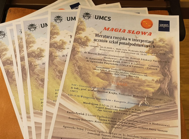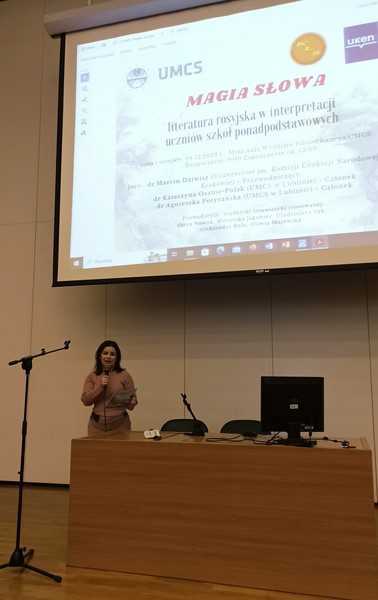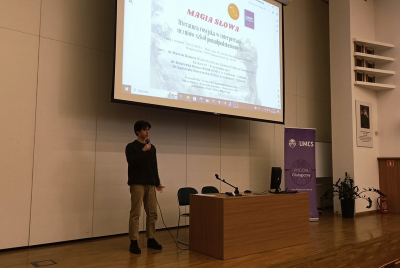 Uczniowie naszej szkoły po raz kolejny stanęli w szranki ogólnopolskiego konkursu recytatorskiego „Magia słowa – literatura rosyjskojęzyczna w interpretacji uczniów szkół ponadpodstawowych”. Konkurs odbył się 8 grudnia na Wydziale Filologicznym UMCS w Lublinie, a został zorganizowany przez Katedrę Lingwistyki Stosowanej UMCS oraz Katedrę Przekładoznawstwa Literatury Rosyjskiej Uniwersytetu Komisji Edukacji Narodowej w Krakowie. Zadanie konkursowe polegało na recytacji dwóch fragmentów utworów (1 poetyckiego i 1 prozatorskiego) w języku rosyjskim.