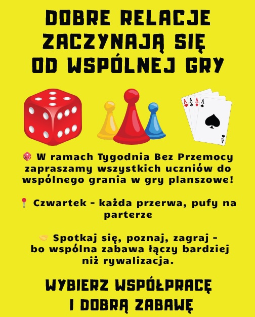 Nasza szkoła włączyła się w ogólnopolską akcję Tygodnia Przeciwdziałania Przemocy Rówieśniczej. Wychowawcy, psycholog, pedagodzy specjalni oraz Samorząd Uczniowski podejmują działania mające na celu profilaktykę przemocy rówieśniczej oraz promowanie pozytywnych postaw wśród uczniów, między innymi warsztaty z psychologiem, akcja szkolna „Dobre relacje zaczynają się od wspólnej gry” (wspólna zabawa z grami planszowymi), spotkanie z prokuratorem, „Dzień solidarności z osobami dotkniętymi przemocą” itp.