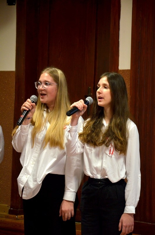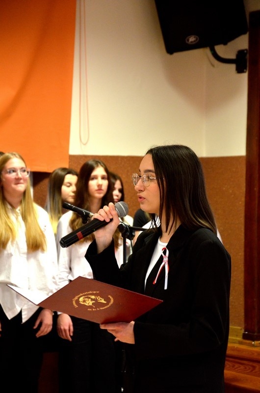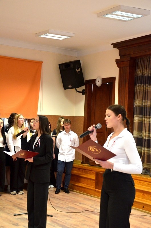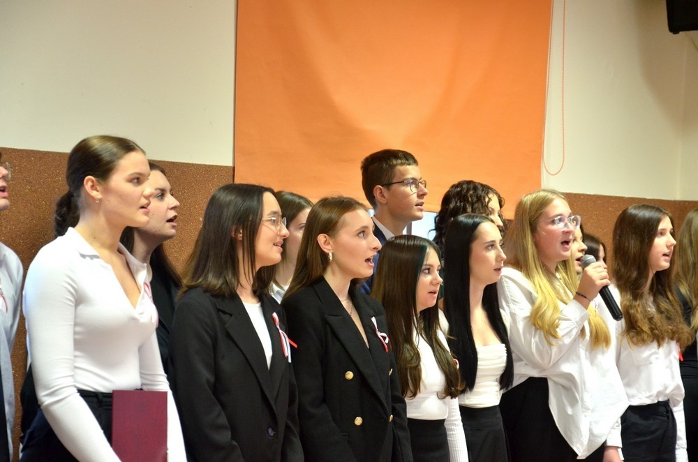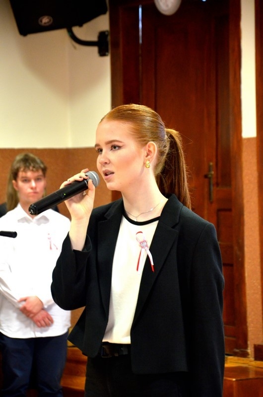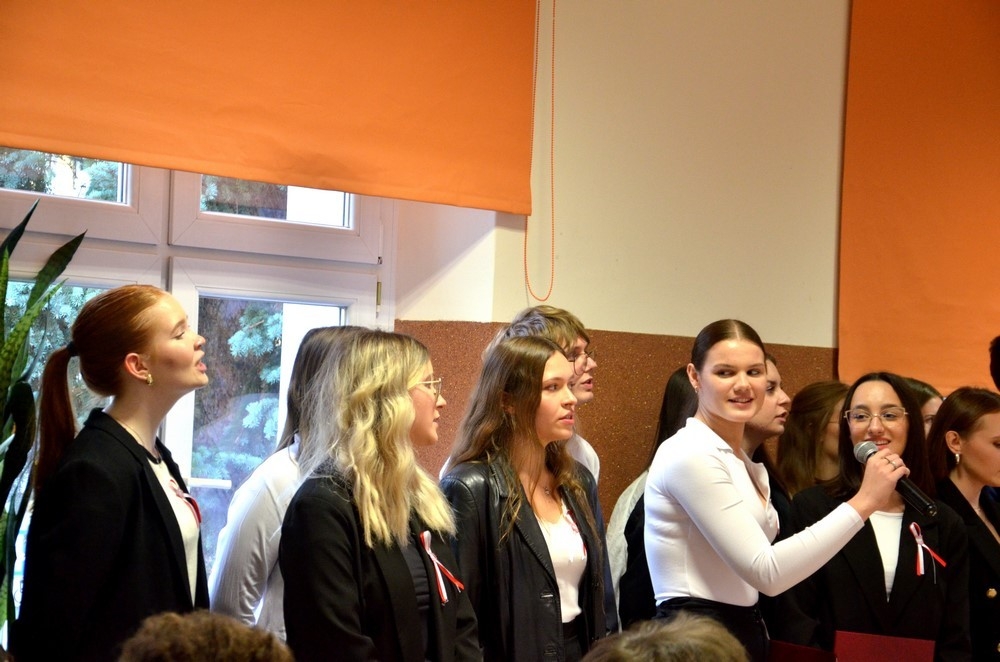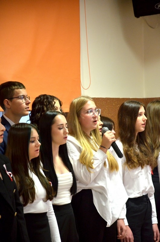Uczennice i uczniowie pod opieką pań: Elżbiety Dąbrowskiej i Agnieszki Jamroż przygotowali muzyczną podróż w czasie, przedstawiając dzieje naszego narodu pod zaborami na podstawie pieśni, które towarzyszyły Polakom w walce o niepodległość. Zgromadzona w auli szkolnej publiczność skorzystała z zaproszenia do wspólnego śpiewania pieśni patriotycznych.
